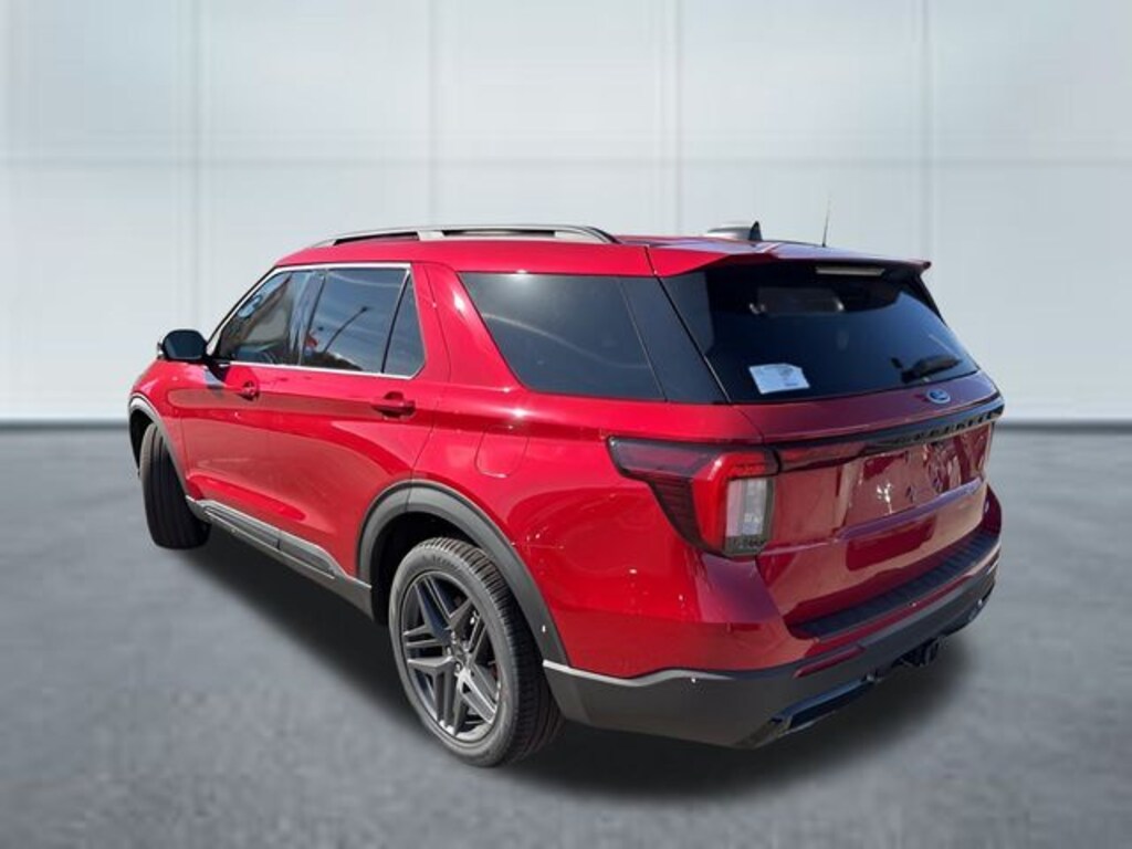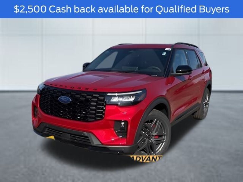 Rapid Red Metallic Tinted Clearcoat 2026 Ford Explorer ST-Line 4WD 10-Speed Automatic 2.3L EcoBoost I-4 10 Speakers, 110V/150W AC Power Outlet, 2nd Row Heated Seats, 3rd row seats: bench, 4-Wheel Disc Brakes, ABS brakes, Air Conditioning, AM/FM radio: SiriusXM with 360L, Ambient Lighting, Apple CarPlay/Android Auto, Auto-Dimming Interior Rear-View Mirror, Automatic temperature control, Brake assist, Compass, Driver door bin, Driver vanity mirror, Dual front impact airbags, Dual front side impact airbags, Electronic Stability Control, Emergency communication system: 911 Assist, Equipment Group 300A Standard Package, Exterior Parking Camera Rear, Four wheel independent suspension, Front anti-roll bar, Front Bucket Seats, Front Center Armrest, Front dual zone A/C, Front reading lights, Garage door transmitter, Heated front seats, Heated steering wheel, Heated Unique Cloth Captain's Chairs, Illuminated entry, Knee airbag, Leather steering wheel, Low tire pressure warning, Manual-Folding Sideview Mirrors, Memory Driver's Seat, Navigation System, Occupant sensing airbag, Outside temperature display, Overhead airbag, Overhead console, Passenger door bin, Passenger vanity mirror, Performance Brakes, Power driver seat, Power Liftgate, Power passenger seat, Power steering, Power windows, Premium Package, Rear air conditioning, Rear reading lights, Rear window defroster, Remote keyless entry, Speed-sensing steering, Split folding rear seat, ST-Line Street Pack, Steering wheel mounted audio controls, Tachometer, Telescoping steering wheel, Tilt steering wheel, Traction control, Trip computer, Wheels: 21" Magnetite-Painted Aluminum.