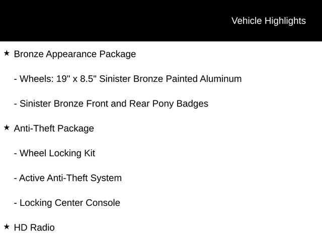 The exterior of this Mustang is a stunning display of Ford's design prowess, with a sleek and aerodynamic profile accentuated by the bold White paint color. The Bronze Appearance Package adds a touch of sophistication, while the Sinister Bronze accents create a striking contrast that is sure to turn heads wherever you go.
