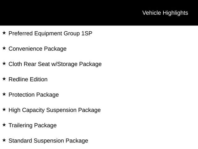10-Way Power Driver Seat w/Lumbar, 12.3" Multicolor Reconfigurable Digital Display, 120-Volt Bed Mounted Power Outlet, 120-Volt Instrument Panel Power Outlet, 170 Amp Alternator, 220 Amp Alternator, 4" Black Round Assist Steps (LPO), 6 Speakers, 6-Speaker Audio System, All-Star Edition, All-Weather Floor Liner (LPO), AM/FM radio: SiriusXM with 360L, Apple CarPlay/Android Auto, Auto-Locking Rear Differential, Automatic Emergency Braking, Auxiliary External Transmission Oil Cooler, Bluetooth® For Phone, Bumpers: body-color, Chevrolet Connected Access Capable, Chevytec Spray-On Black Bedliner, Cloth Rear Seat w/Storage Package, Cloth Seat Trim, Color-Keyed Carpeting Floor Covering, Compass, Convenience Package, Deep-Tinted Glass, Driver door bin, Driver vanity mirror, Dual Exhaust w/Black Exhaust Tips, Dual Exhaust w/Polished Outlets, Dual Rear USB Ports (Charge Only), Dual-Zone Automatic Climate Control, Electric Rear-Window Defogger, Electrical Steering Column Lock, Electronic Cruise Control, Engine Block Heater, External Engine Oil Cooler, EZ Lift Power Lock & Release Tailgate, Following Distance Indicator, Forward Collision Alert, Front Frame-Mounted Black Recovery Hooks, Front LED Fog Lamps, Front License Plate Kit, Front Pedestrian Braking, Front reading lights, Front Rubberized Vinyl Floor Mats, HD Rear Vision Camera, Heated door mirrors, Heated Driver & Front Outboard Passenger Seats, Heated Power-Adjustable Outside Mirrors, Heated Steering Wheel, Heated steering wheel, High Capacity Suspension Package, High Gloss Black Door Handles, High Gloss Black Grille, High Gloss Black Mirror Caps, Hitch Guidance, Illuminated entry, Inside Rear-View Mirror w/Tilt, IntelliBeam Automatic High Beam On/Off, Keyless Open & Start, Lane Keep Assist w/Lane Departure Warning, LED Cargo Area Lighting, Molded Black Splash Guards (LPO), Multi-Flex Tailgate, OnStar & Chevrolet Connected Services Capable, Performance Red Recovery Hooks, Power door mirrors, Power Front Windows w/Driver Express Up/Down, Power Front Windows w/Passenger Express Down, Power Rear Windows w/Express Down, Preferred Equipment Group 1SP, Protection Package, Rear 60/40 Folding Bench Seat (Folds Up), Rear Rubberized-Vinyl Floor Mats, Rear step bumper, Rear Wheelhouse Liners, Redline Edition, Remote Vehicle Starter System, SiriusXM w/360L, Standard Suspension Package, Standard Tailgate, Steering Wheel Audio Controls, Theft Deterrent System (Unauthorized Entry), Trailering Package, Wheels: 20" x 9" High Gloss Black Painted Aluminum, Wi-Fi Hot Spot Capable, Wireless Phone Projection, Wrapped Steering Wheel.