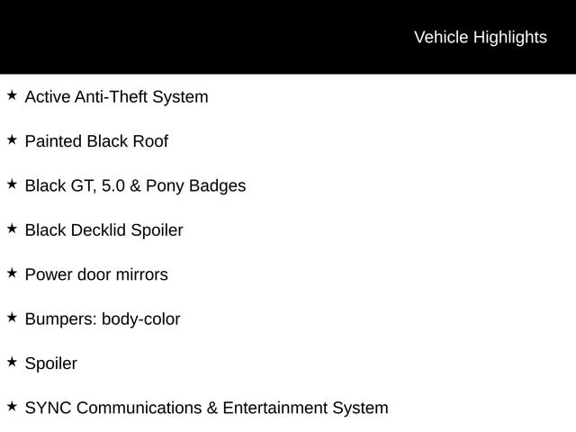 - Black Accent Package: Includes 19-inch Black-Painted Aluminum wheels, Black decklid spoiler, and Black GT, 5.0 & Pony badges