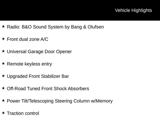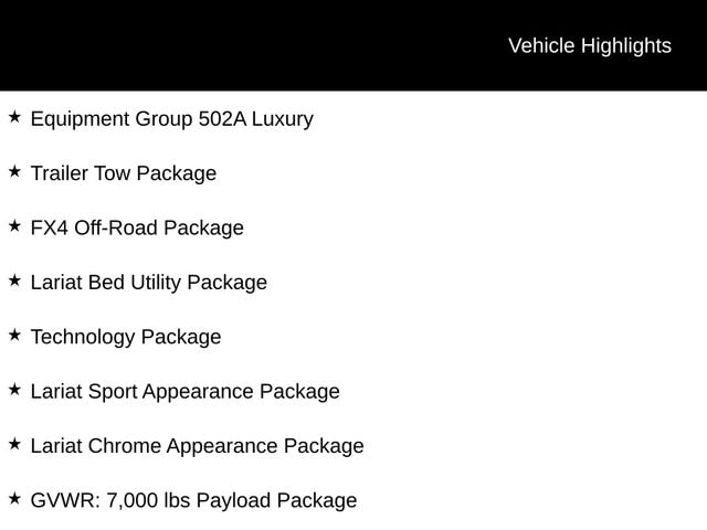110V/400W Outlet, 2-Bar Body-Color Grille w/4 Minor Bars, 2nd Row Heated Seats, 360 Camera w/Split-View Display, 4x4 FX4 Off-Road Bodyside Decal, ABS brakes, Accent-Color Angular Step Bars, Active Park Assist, Alloy wheels, Body-Color Front & Rear Bumpers, Box Side Decals, Chrome 2-Bar Grille w/4 Minor Bars, Chrome Angular Step Bars, Chrome Door & Tailgate Handles w/Body-Color Bezel, Chrome Skull Caps on Exterior Mirrors, Class IV Trailer Hitch Receiver, Compass, Electronic Stability Control, Engine Oil Cooler, Equipment Group 502A Luxury, Front dual zone A/C, FX4 Off-Road Package, GVWR: 7,000 lbs Payload Package, Heated door mirrors, Heated front seats, Heated Steering Wheel, Hill Descent Control, Illuminated entry, Lariat Bed Utility Package, Lariat Chrome Appearance Package, Lariat Sport Appearance Package, Leather-Trimmed Bucket Seats, LED Sideview Mirror Spotlights, Low tire pressure warning, Off-Road Tuned Front Shock Absorbers, Power Glass Sideview Mirr w/Chrome Skull Caps, Power Tilt/Telescoping Steering Column w/Memory, Pro Trailer Backup Assist, Quad Beam LED Headlamps & LED Taillamps/Fog Lamps, Radio: B&O Sound System by Bang & Olufsen, Rain-Sensing Wipers, Remote keyless entry, Remote Start System w/Remote Tailgate Release, Reverse Sensing System, Single-Tip Chrome Exhaust, Technology Package, Traction control, Trailer Tow Package, Tray Style Floor Liner, Twin Panel Moonroof, Universal Garage Door Opener, Upgraded Front Stabilizer Bar, Wheels: 18" 6-Spoke Machined-Aluminum, Wheels: 18" Chrome-Like PVD, Windshield Wiper De-Icer.