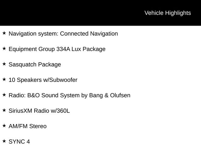 - SASQUATCH PACKAGE: Enhancing the Bronco's off-road prowess with high-clearance fender flares, position-sensitive Bilstein shock absorbers, and 17-inch black high-gloss-painted aluminum wheels.