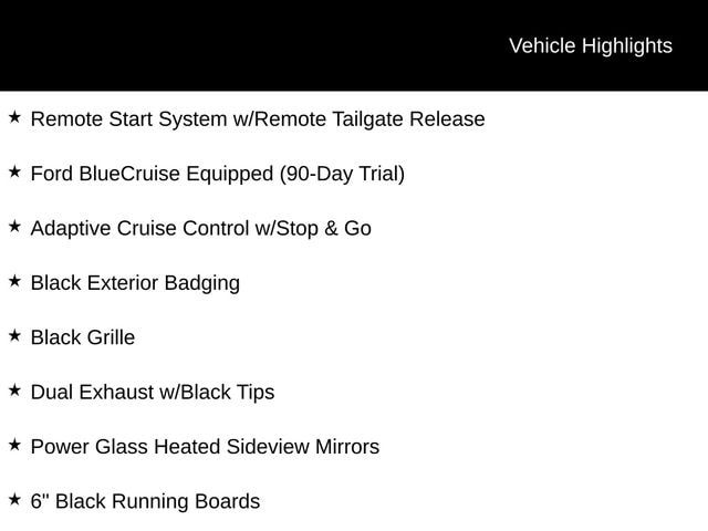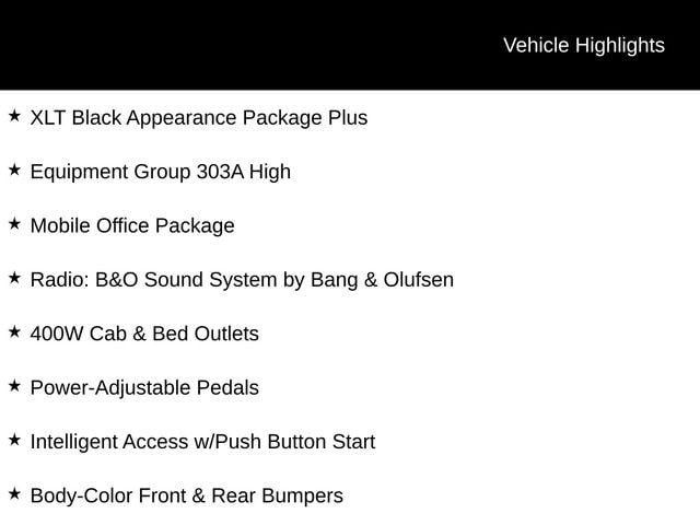 - EQUIPMENT GROUP 303A HIGH: Includes Power-Adjustable Pedals, Adaptive Cruise Control w/Stop & Go, Lane Centering, Speed Sign Recognition, Intelligent Access w/Push Button Start, 400W Cab & Bed Outlets, Ford BlueCruise Equipped (90-Day Trial), Radio: B&O Sound System by Bang & Olufsen, Mobile Office Package, Power-Sliding Rear Window, Remote Start System w/Remote Tailgate Release, Heated Front Seats, Power Glass Heated Sideview Mirrors, Auto-Dimming Rearview Mirror