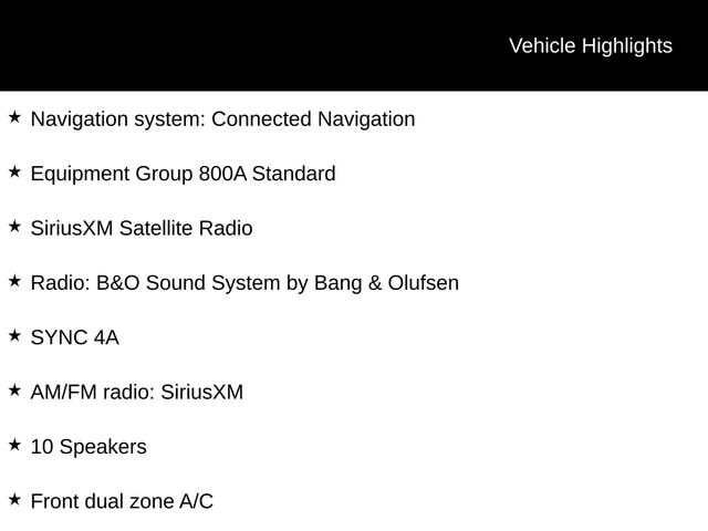 - 10 Speakers, AM/FM radio: SiriusXM, Radio: B&O Sound System by Bang & Olufsen, SiriusXM Satellite Radio, SYNC 4A