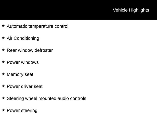 - Memory seat, Power driver seat, Power steering, Power windows, Remote keyless entry, Steering wheel mounted audio controls, Speed control