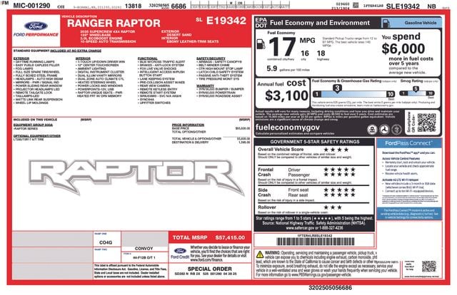The Ranger Raptor's 3.0L EcoBoost V6 engine and 10-speed automatic transmission deliver exceptional power and efficiency, with 16 city/18 highway MPG. Equipped with 4WD, this truck is ready to take on any adventure, whether it's conquering the desert, navigating rugged trails, or tackling your daily commute with ease.
