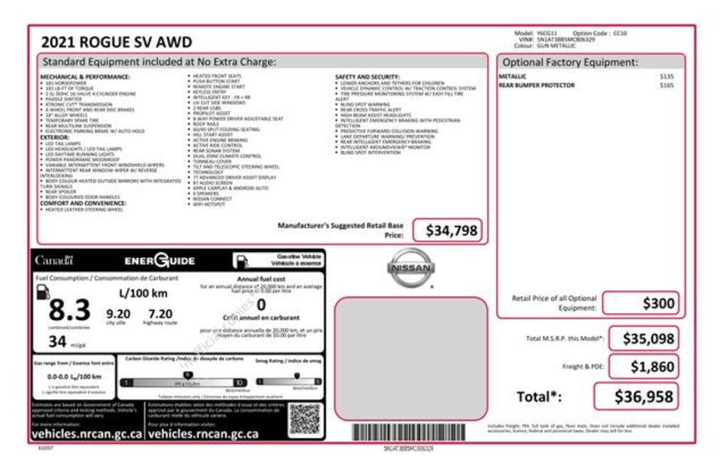 18" Aluminum Alloy Wheels, 4-Wheel Disc Brakes, 5.604 Axle Ratio, 6 Speakers, ABS brakes, Air Conditioning, Alloy wheels, AM/FM Radio, AM/FM radio, Auto High-beam Headlights, Automatic temperature control, Brake assist, Bumpers: body-color, Cloth Seat Trim, Delay-off headlights, Driver door bin, Driver vanity mirror, Dual front impact airbags, Dual front side impact airbags, Electronic Stability Control, Emergency communication system: NissanConnect Services, Four wheel independent suspension, Front anti-roll bar, Front Bucket Seats, Front Center Armrest, Front dual zone A/C, Front reading lights, Fully automatic headlights, Heated door mirrors, Illuminated entry, Knee airbag, Low tire pressure warning, NissanConnect featuring Apple CarPlay and Android Auto, Occupant sensing airbag, Outside temperature display, Overhead airbag, Overhead console, Panic alarm, Passenger door bin, Passenger vanity mirror, Power door mirrors, Power driver seat, Power steering, Power windows, Radio data system, Rear anti-roll bar, Rear Parking Sensors, Rear seat center armrest, Rear side impact airbag, Rear window defroster, Rear window wiper, Remote keyless entry, Security system, Speed control, Speed-Sensitive Wipers, Split folding rear seat, Spoiler, Steering wheel mounted audio controls, Tachometer, Telescoping steering wheel, Tilt steering wheel, Traction control, Trip computer, Turn signal indicator mirrors, Variably intermittent wipers.